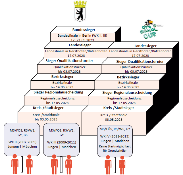 Großfeld: max. 15 Jungen von einer Schule; gespielt wird mit 1 Torhüter, 10 Feldspielern und höchstens 4 Auswechselspielern
